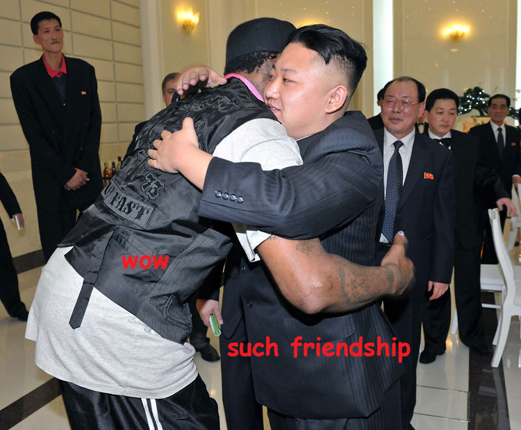 North Korea and the dear leaders greatest international allie and best friend ever is none other than fomer chicago bull foward Dennis Rodman. Rodman was a long time fan of the dear leader because of his relationship with his people, stylish choice of attire and beautiful jet black hair. He begged the weak and powerless American govenment to let him see his idol in North Korea for years. In 2013 the helpless American Govenment let Rodman journey to the DPRK with the help of the harlem Globetrotters and a film crew. apon meeting the beloved leader Kim Jong Un he professed that he was his "friend for life" and hoped that the weak American Govenment and the mighty North Korean Govenment could set aside their differences.