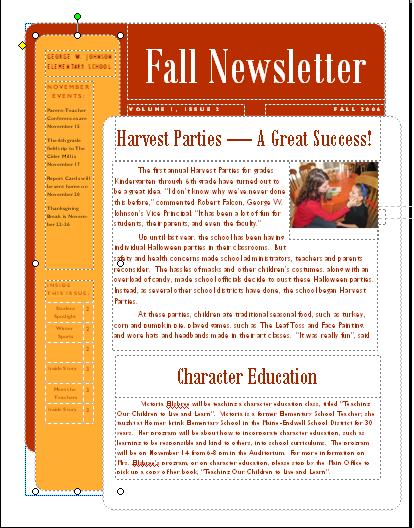 For this project, I made a calendar and newsletter with Microsoft Publisher. I opened Microsoft Publisher 2003 under Microsoft Office. Then I clicked on "publications for print" on the left, and then chose "calendar" for my calendar, and "newletter" for my newsletter. For the calendar, I chose the "borders calendar", because I liked the way it looked. I made sure it was in landscape orientation, monthly and no schedule of events on the left side. Then I simply started typing in information. I based it on the elementary school I used to go to, George W. Johnson. I changed the border to match the school colors, orange and black. I found a picture of a tiger, the school mascot, from clip art. For my newletter, I chose "banded newsletter" because it seemed like a good look for a fall newletter, which I decided to do. Again, I based it on my former elementary school. I made up articles I thought it would contain, and made up names and quotes to use as well. I found pictures off the Internet that related to the subject and pasted them on. The hardest part of the project was making the thumbnails below. I took a "print screen" with that button on the upper right side of my keyboard. Then I pasted this into Paint program. Then I cropped it so it looked nice, and saved this in Paint. Finally, I copied and pasted into Composer, and resized the image. I saved this as a .jpeg on my flashdrive. Then I made the images linked to the Microsoft Publisher product.