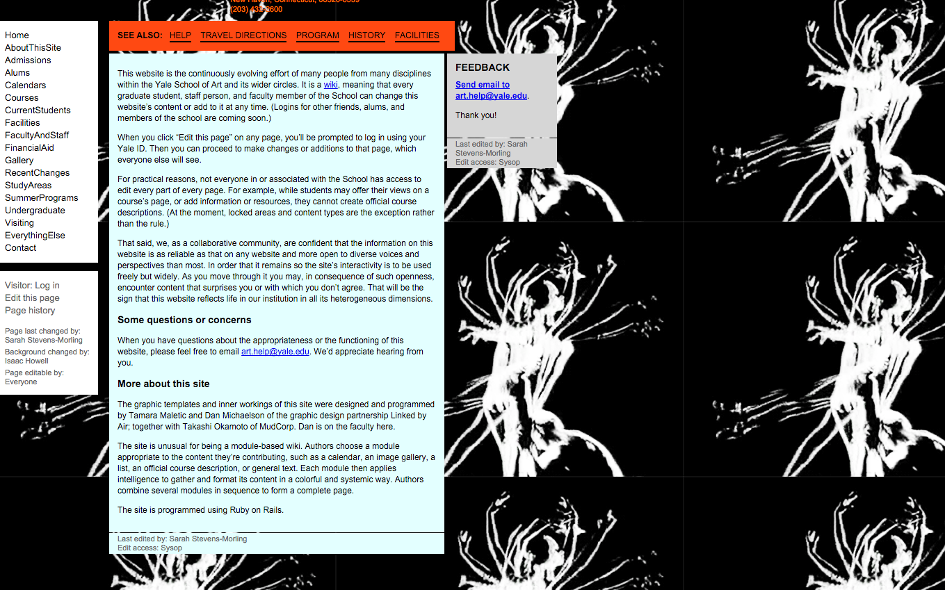 The website is a custom-built wiki page, that allows students, faculty, and staff to edit all pages, and to add new ones. Although the idea of having students and faculty to able to edit and take charge of designing the website is great, but not quite effective. After 5 minutes of browsing through the webpages I couldn’t help but noticed the headache I got from all the colors, movement and clutter all over the site. The site is pretty functional, despite the eye sore and isn’t organized well. I do think there is too much content in the website or at least there must be a better way to organize everything that’s included. There is so much content that in some pages you can find more than one navigation bar. For instance, the website includes a list of all the graduate students enlisted in the university alongside their field of discipline and year.